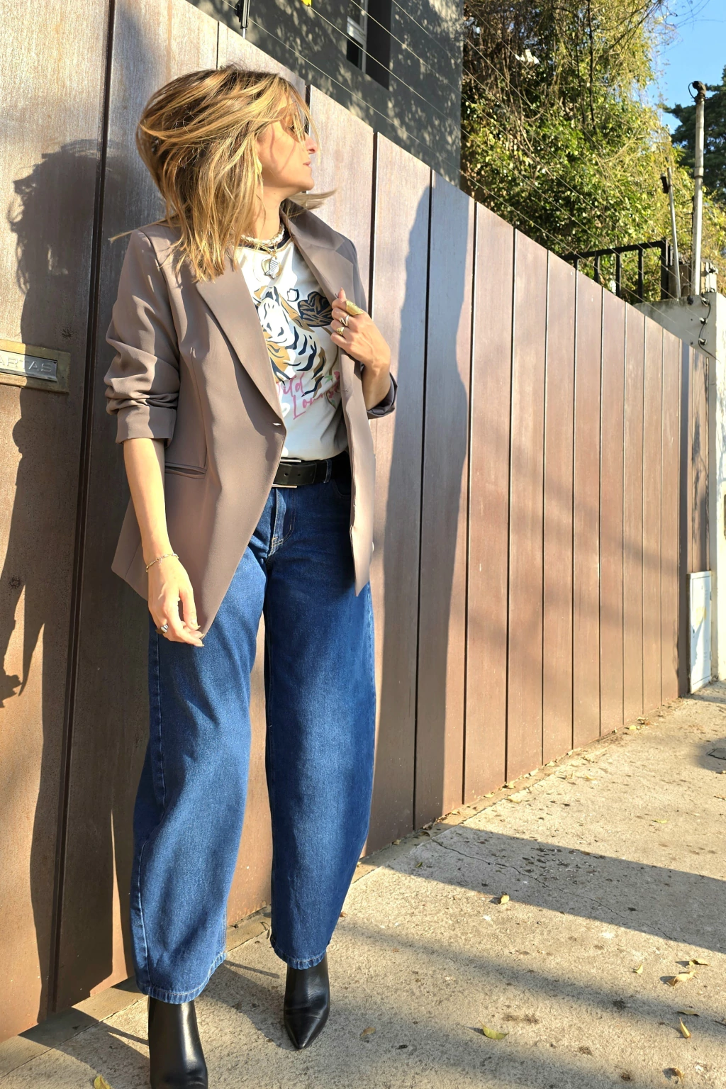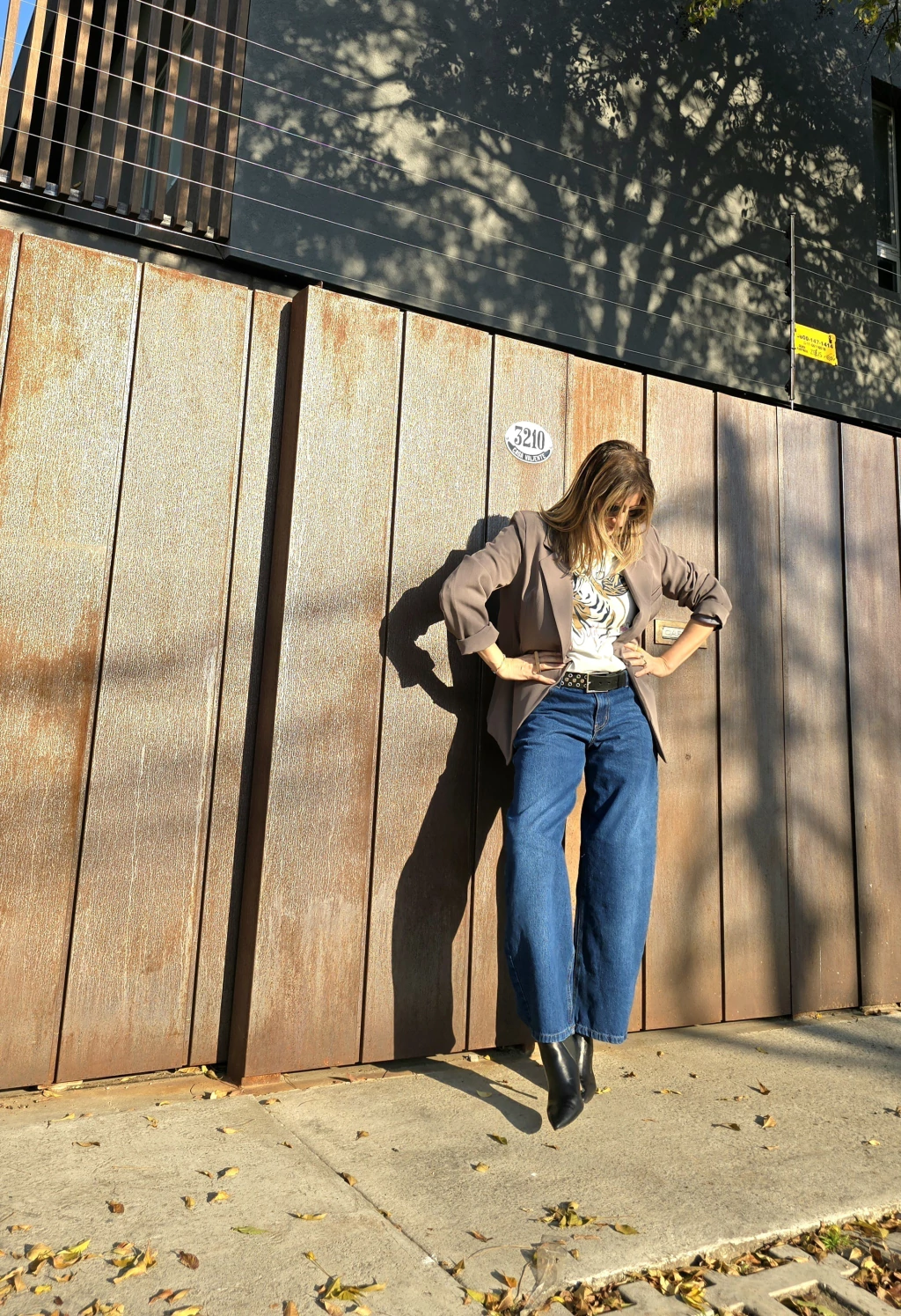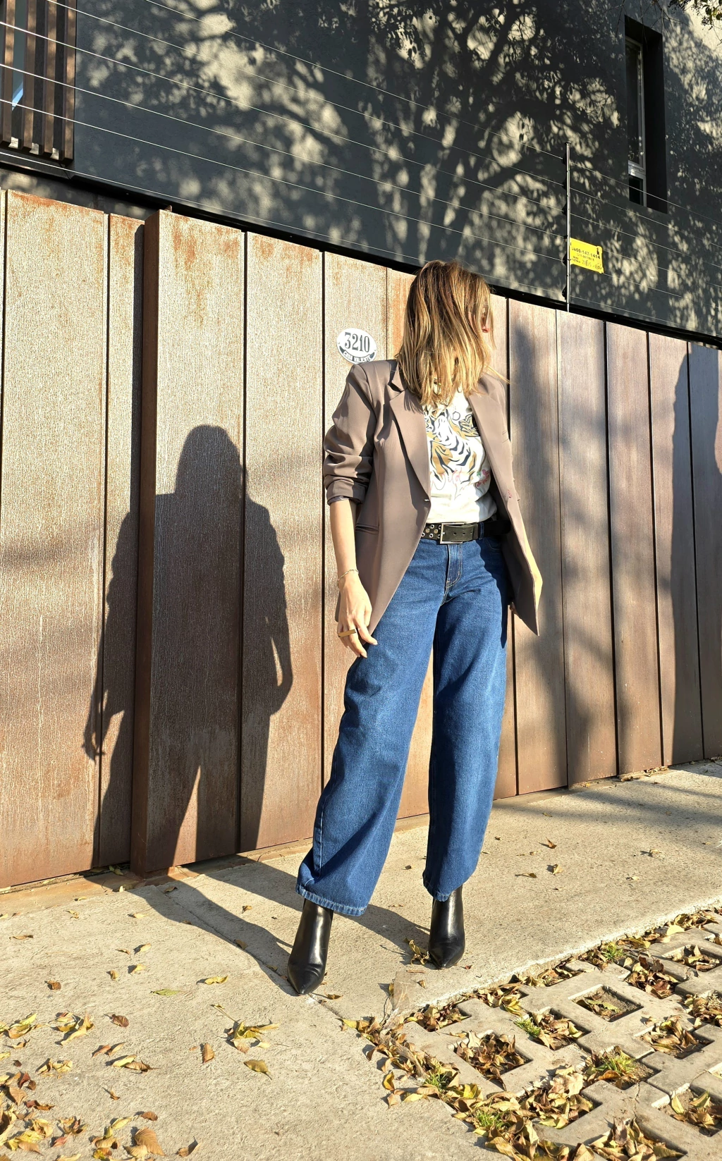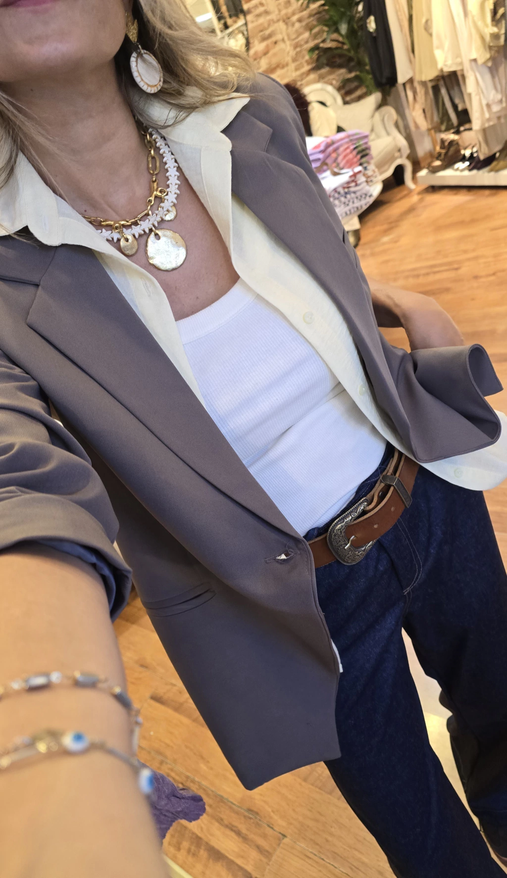 Blazer corte sastrero forrado con hombreras y bolsillos, teminación Al frente en pico.
