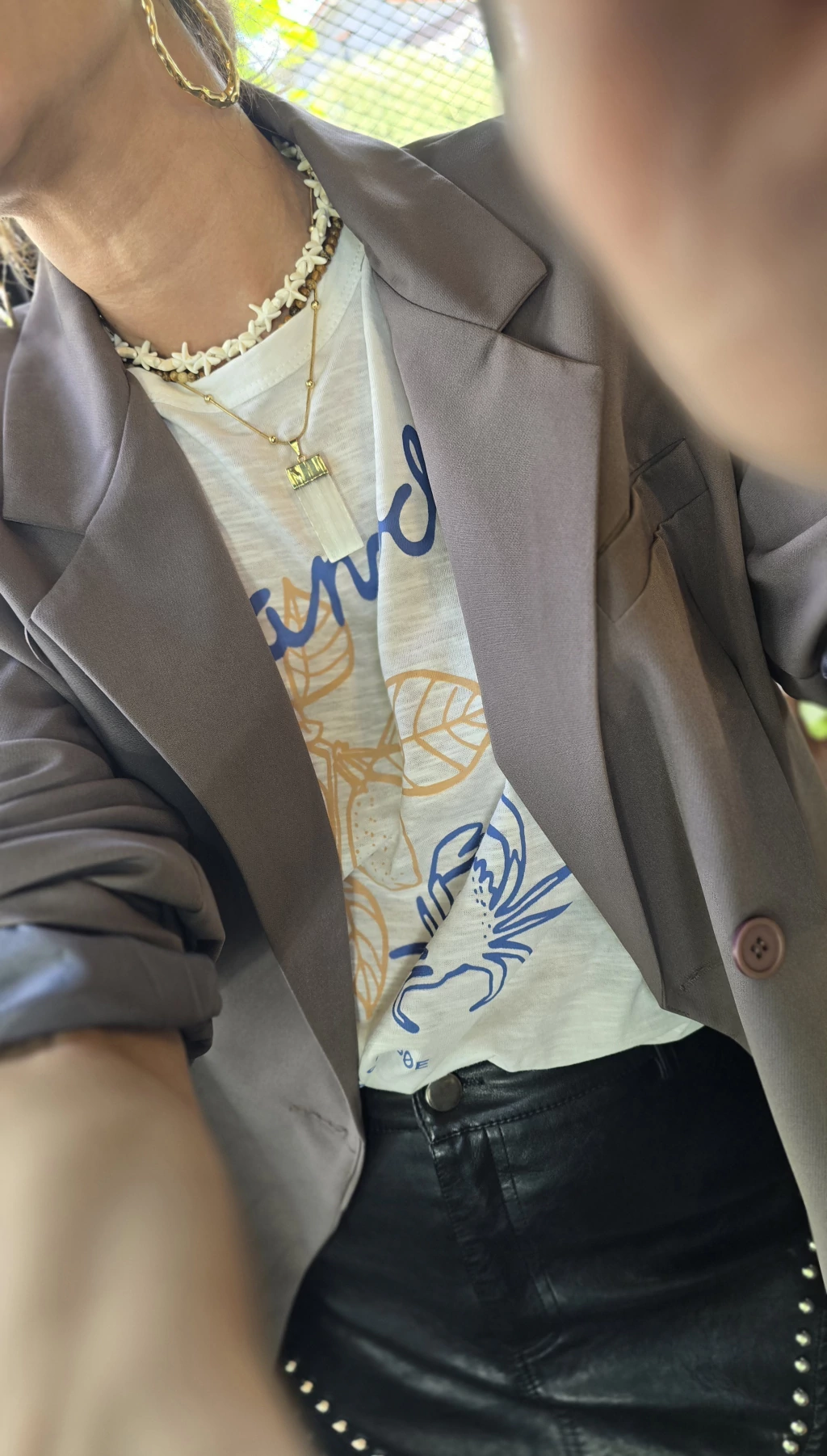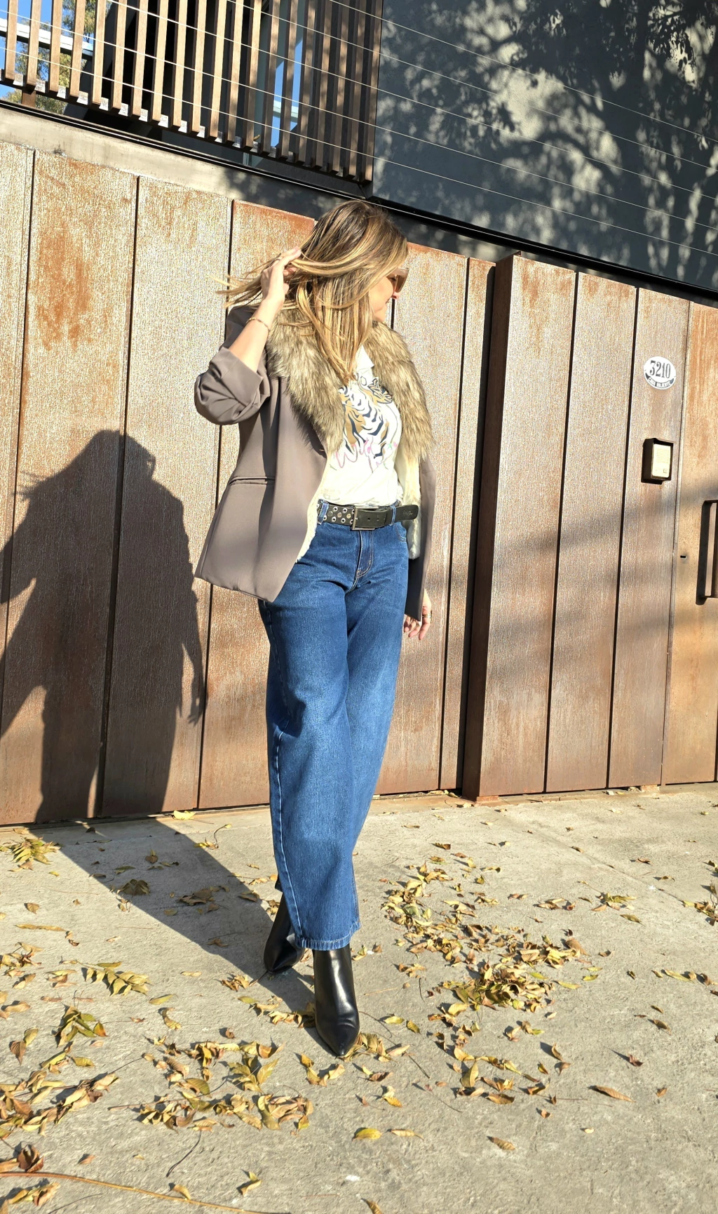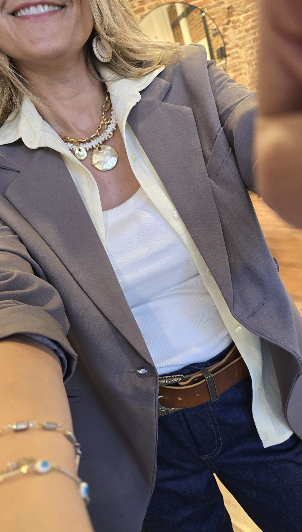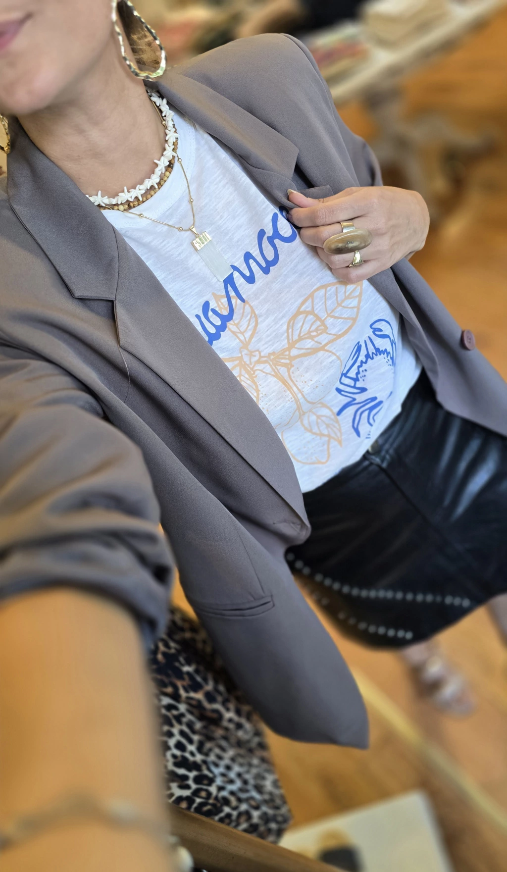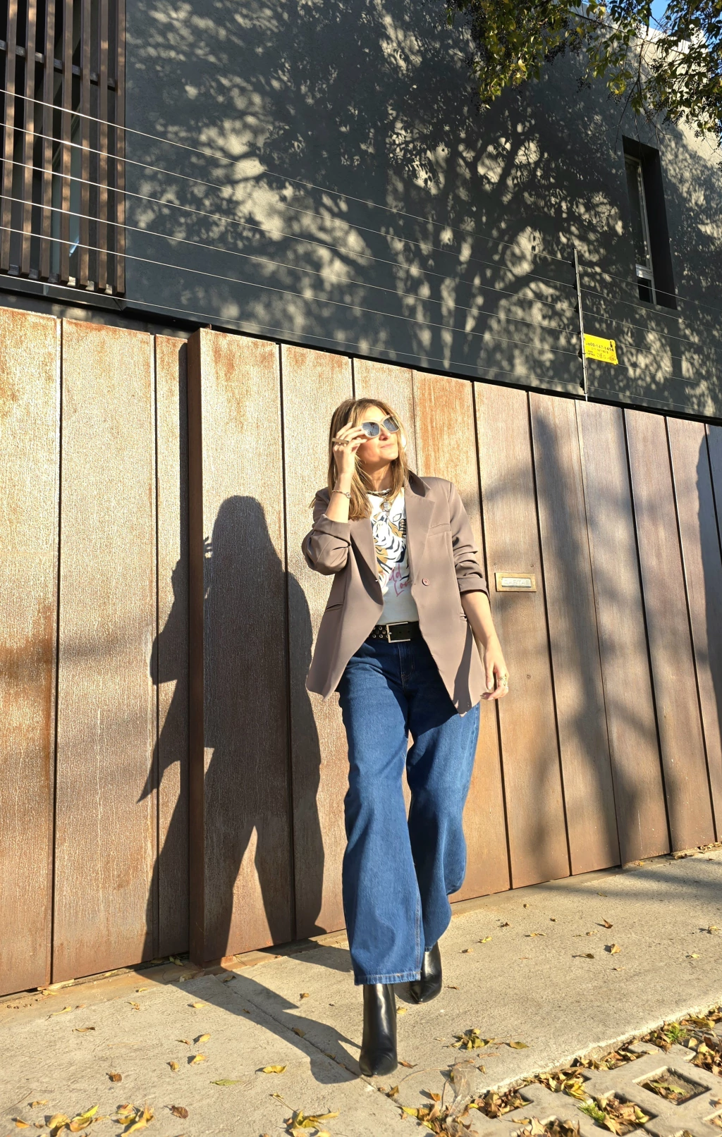 Blazer corte sastrero forrado con hombreras y bolsillos, teminación Al frente en pico.