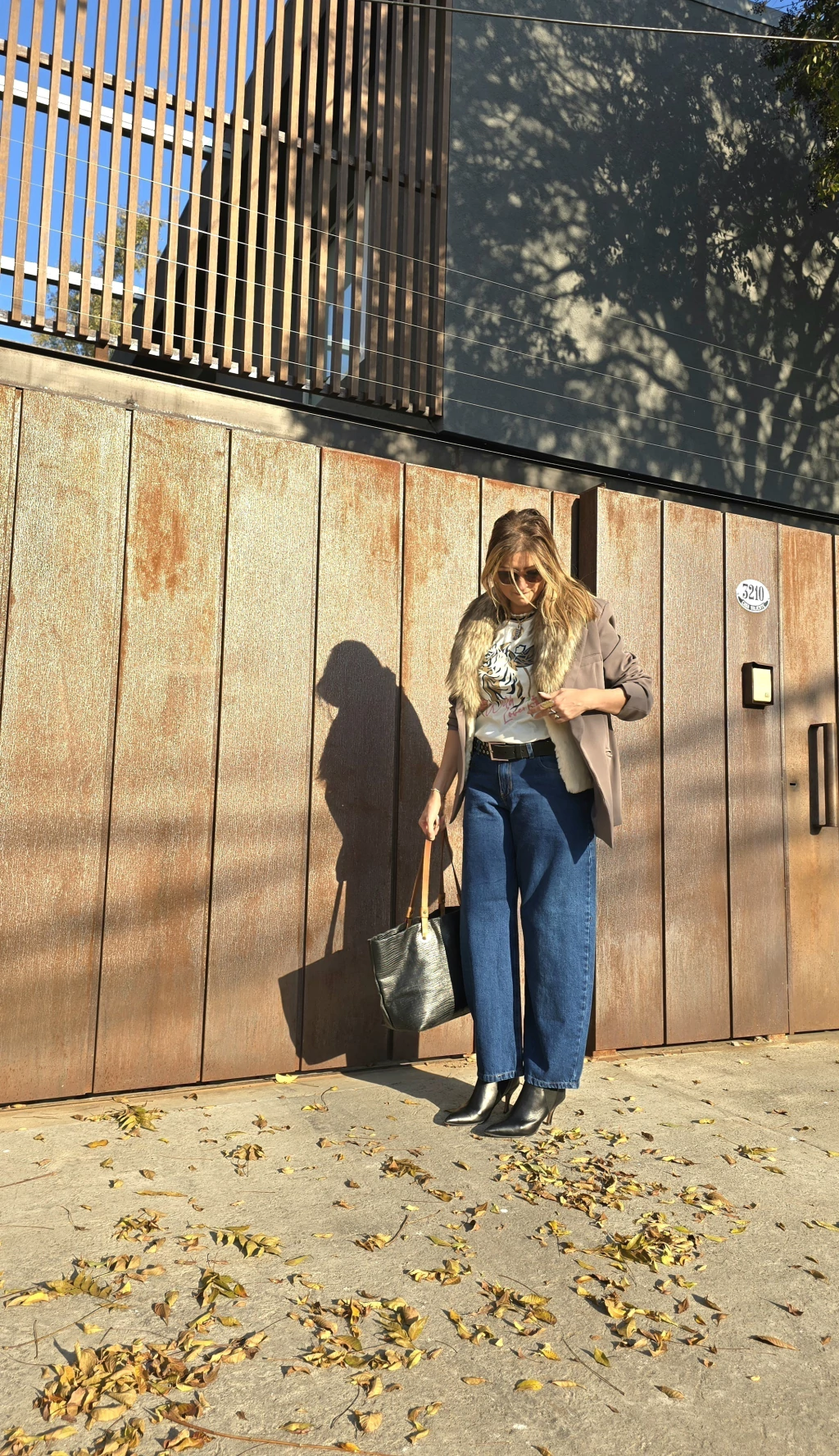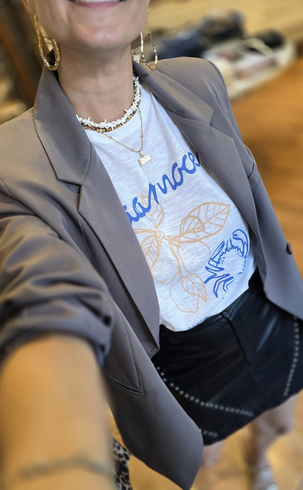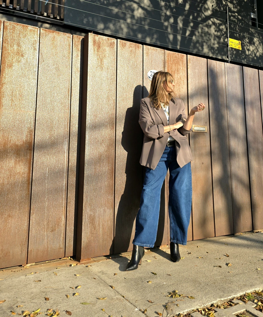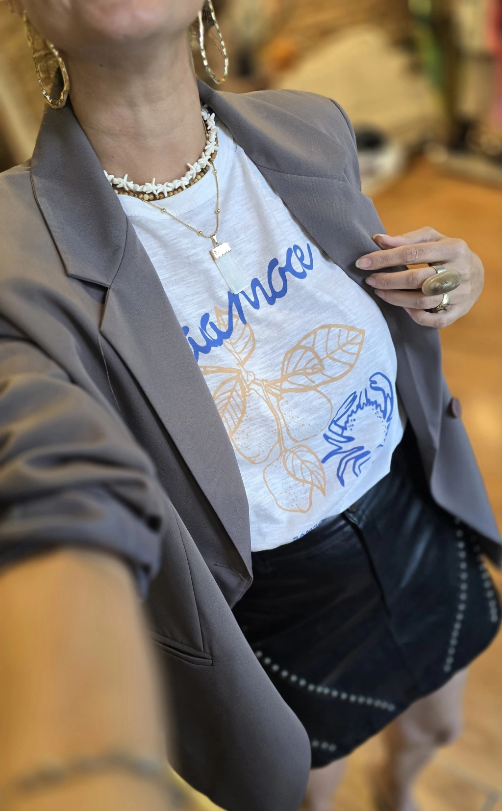 Blazer corte sastrero forrado con hombreras y bolsillos, teminación Al frente en pico.