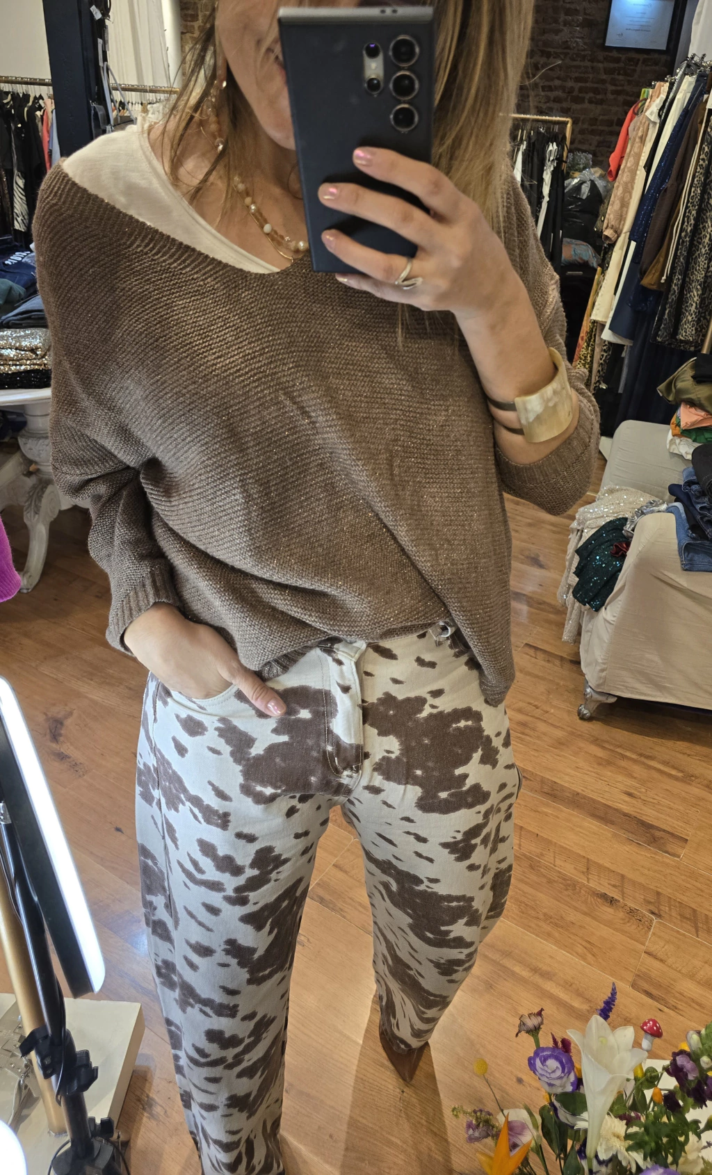 Descubre nuestro Jean de Corte Relajado Semi Caído, una prenda versátil y cómoda, ideal para cualquier ocasión. Su suavizada y liviana textura, combinado con una atractiva estampa cow en tonos tierra, te brindará un look único.