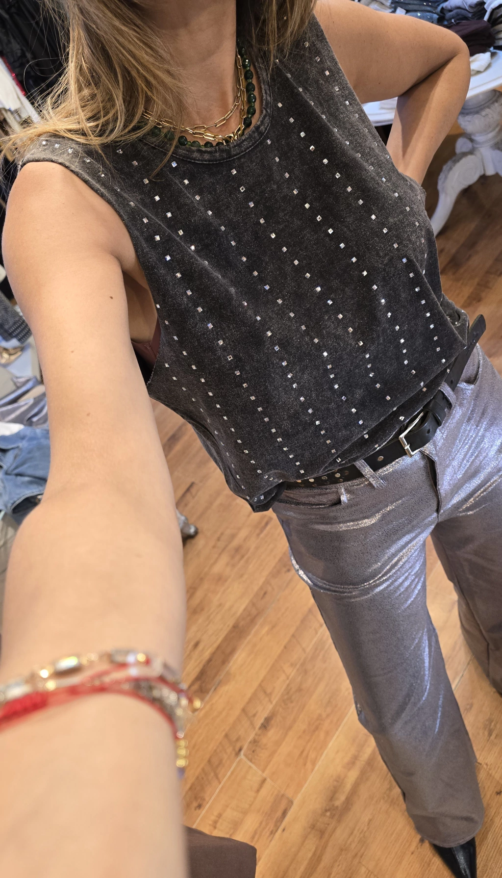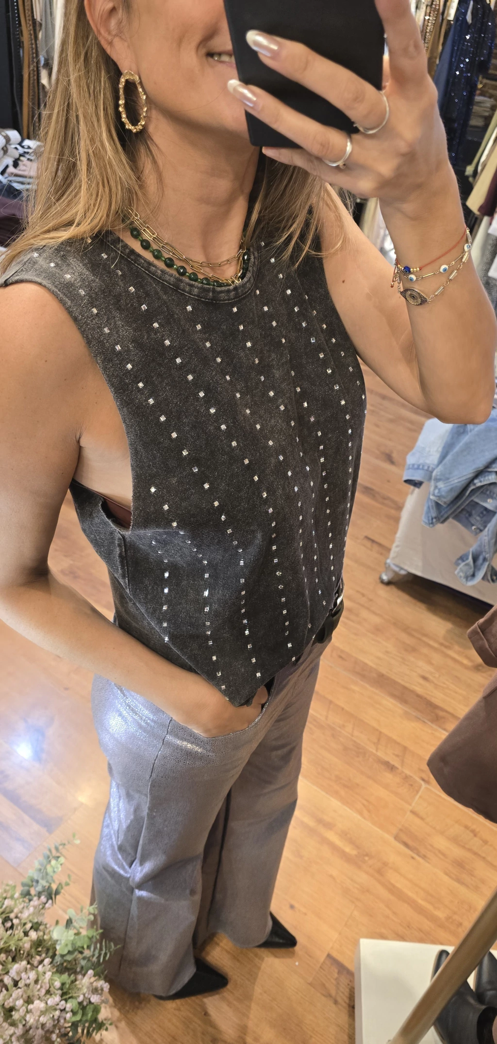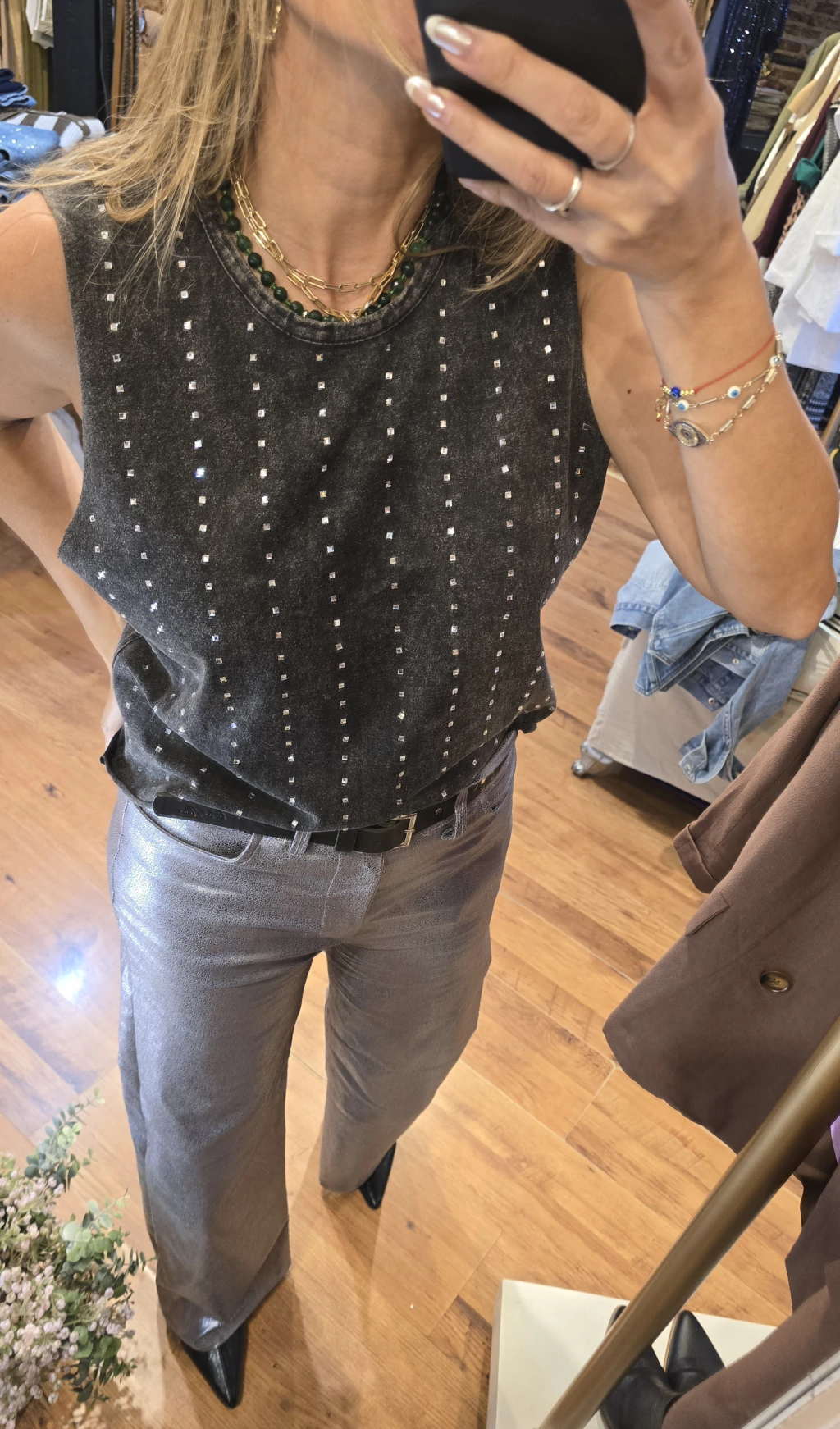 Musculosa batik corte recto estilo sudadera full strass al frente.