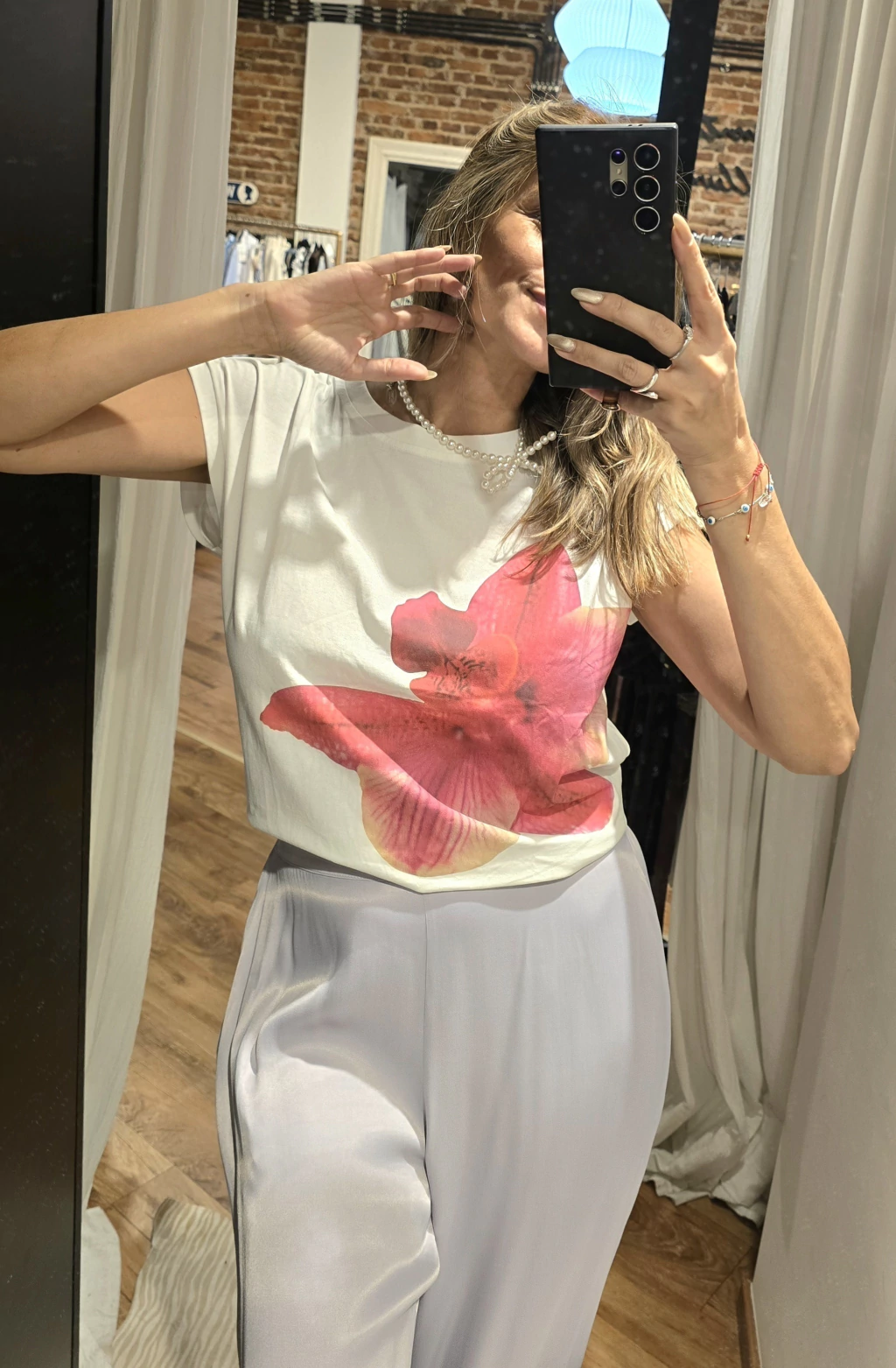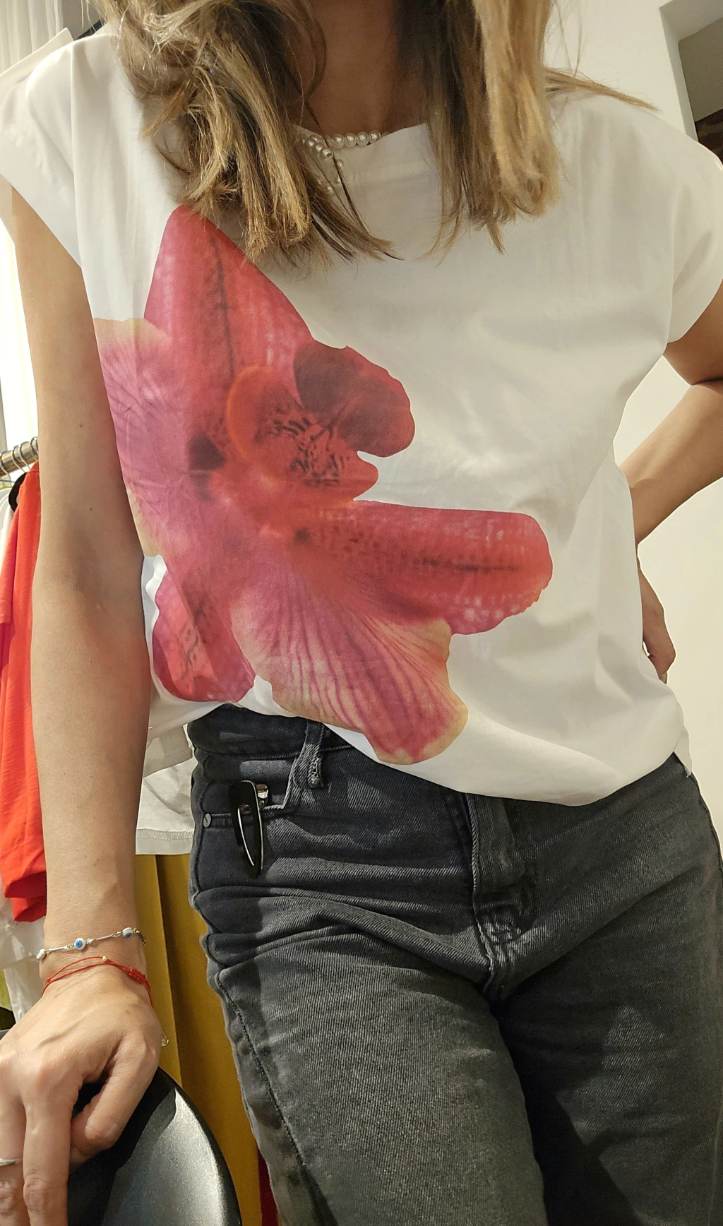 Remera de algodón con lycra con estampa al frente, corte recto, manga japonesa con charretera y tajos laterales.