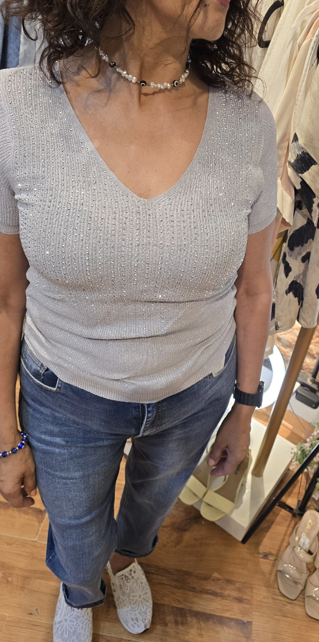Remera de hilo y lurex, escote en V con detalles de strass al frente. Talle único.