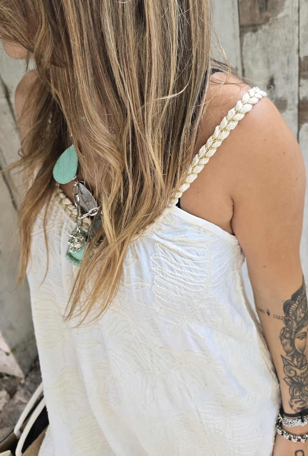 Solero de algodón labrado, calidad premium. Breteles trenzado en algodñon y lurex, con bolsillos laterales y ruedo con volado.