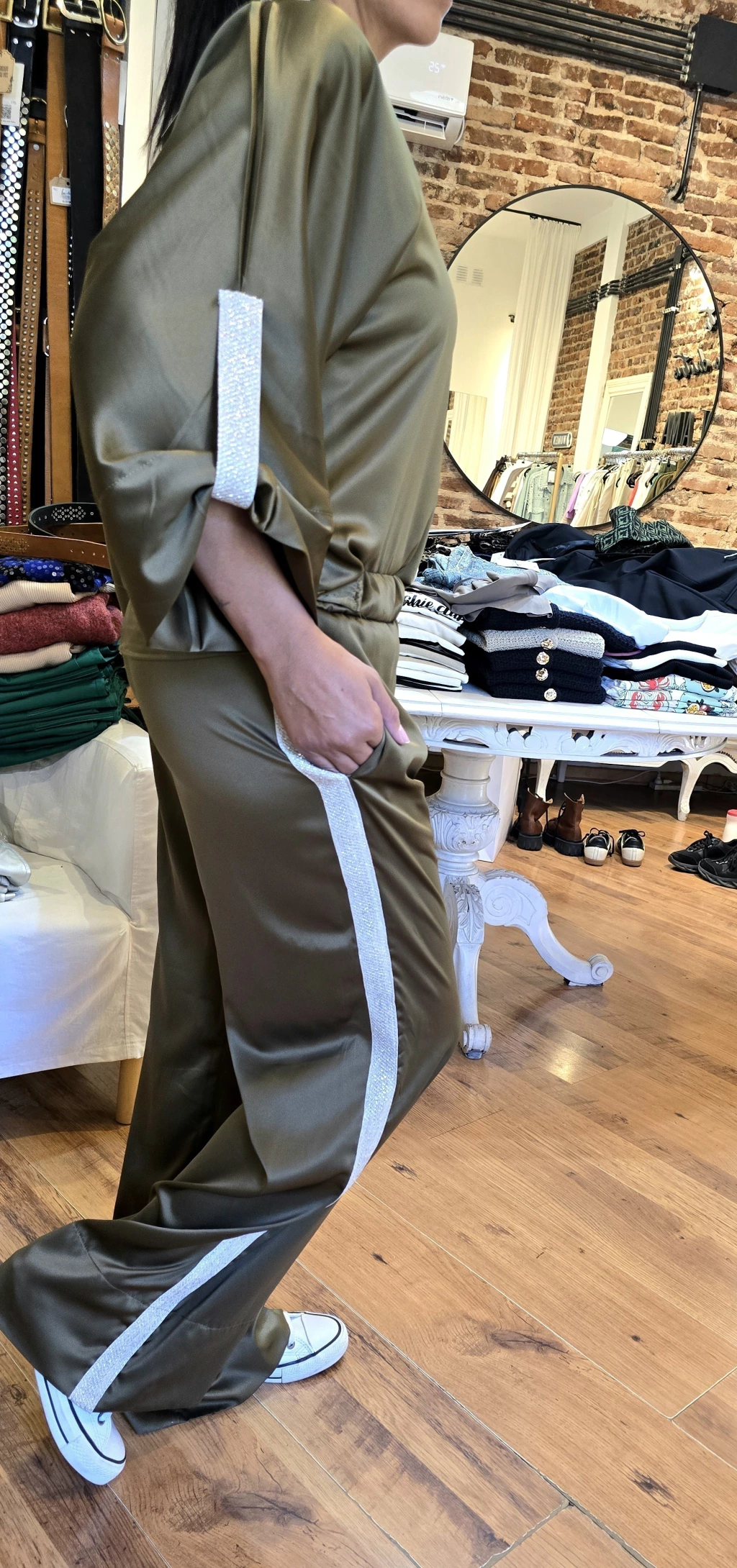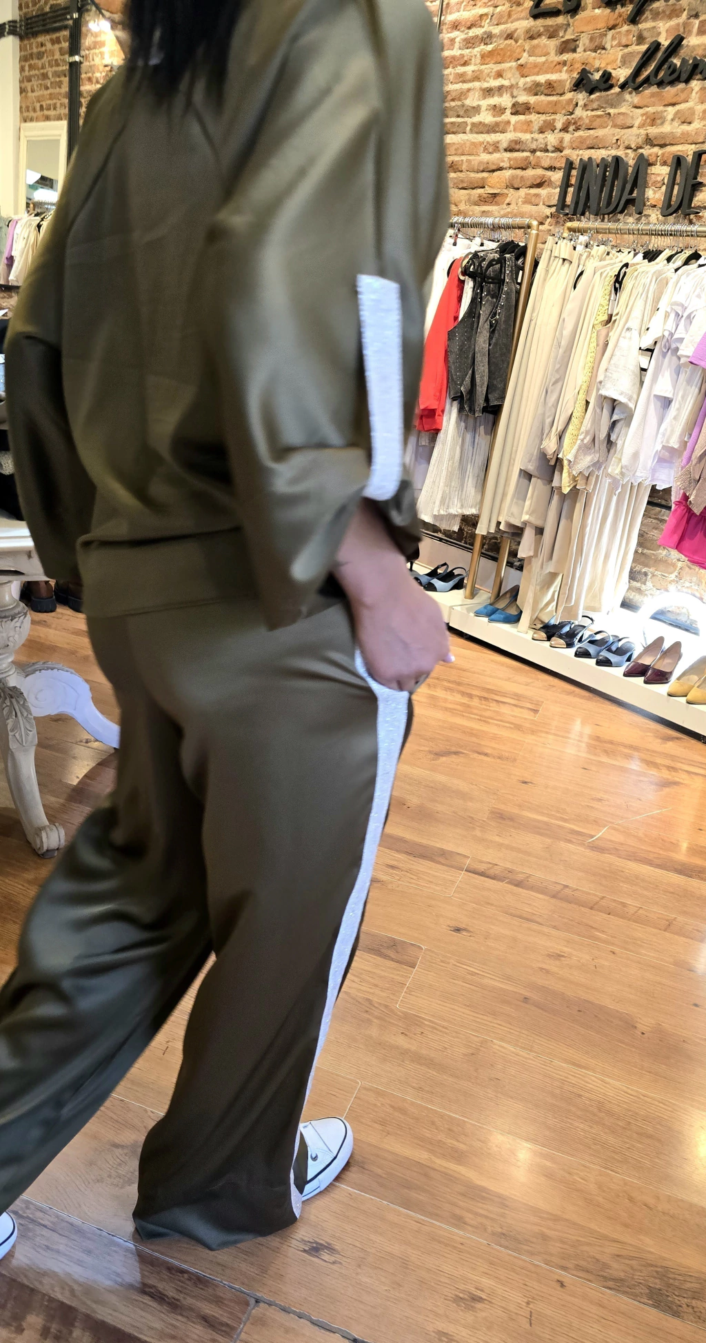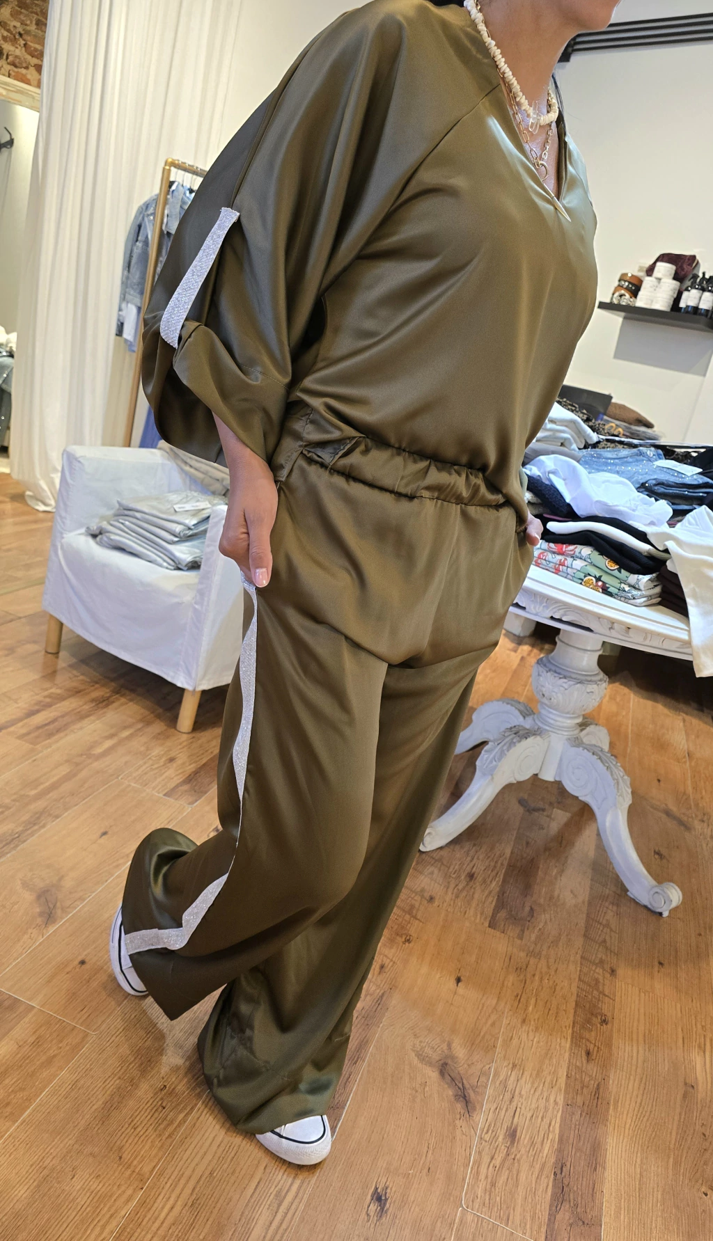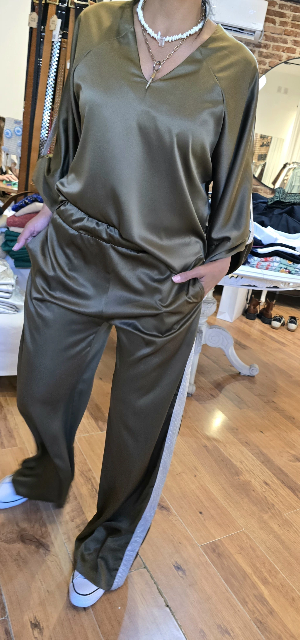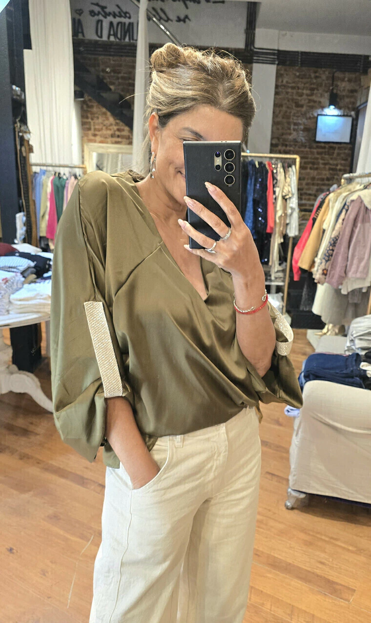 Blusa de satén con spandex escote en V, manga ranglan con detalle de galón de lurex en puño y tajos laterales un mejor calce.