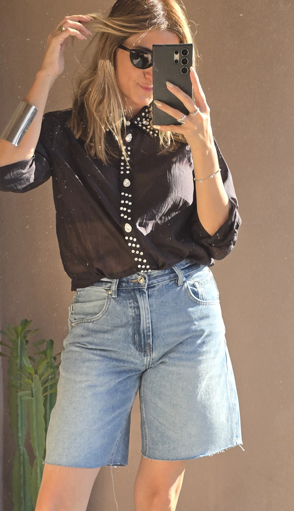 Bermuda de jean rígido, tiro medio con ruedo al corte (Sin dobladillo).