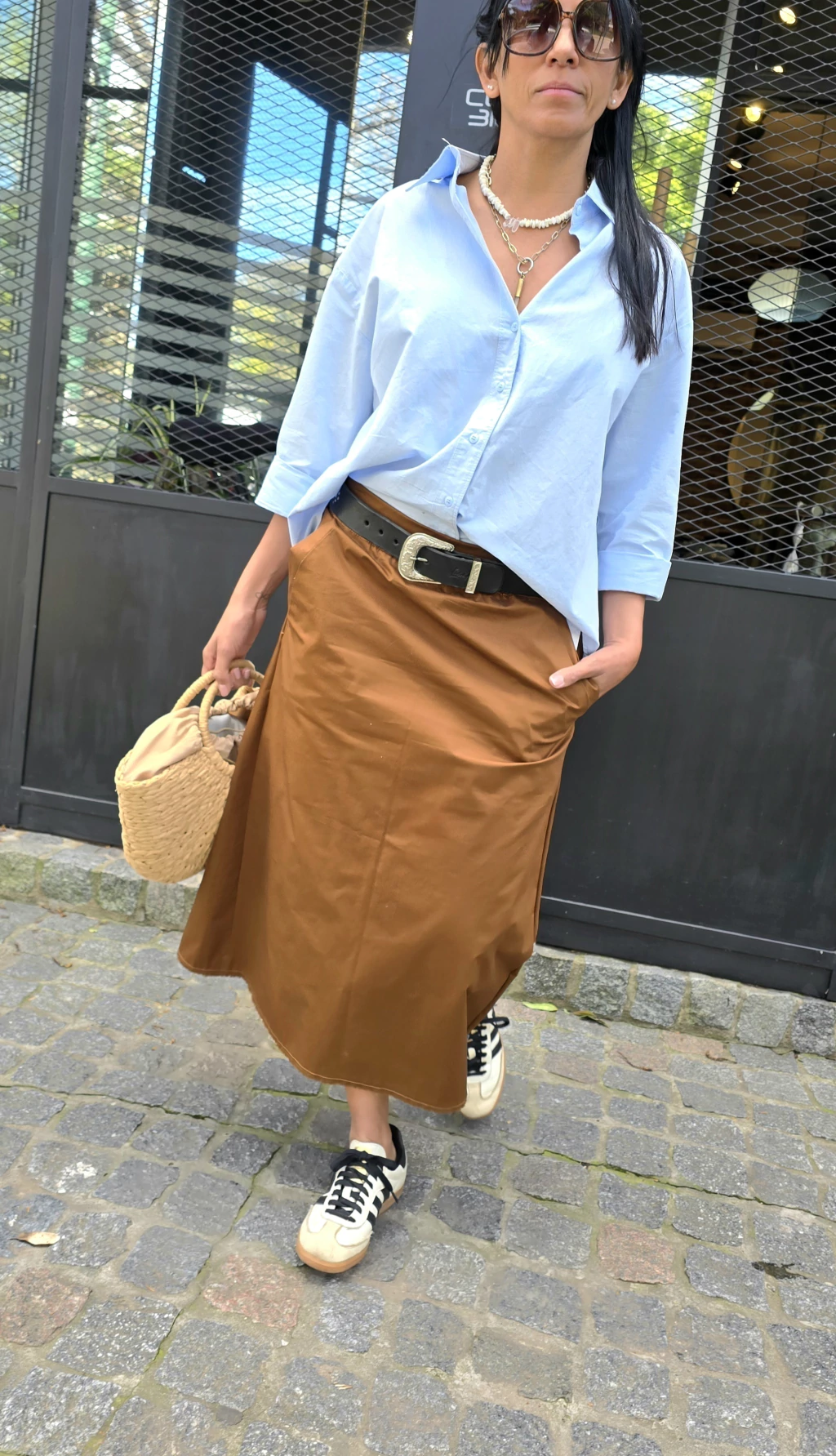 Falda con cintura plana al frente y elástico detrás con bolsillos laterales y detelle de cordón. Tajo en la parte trasera y un sutíl desflecado en la terminación. "TRAE SU CHAQUETA PARA ARMAR SET"