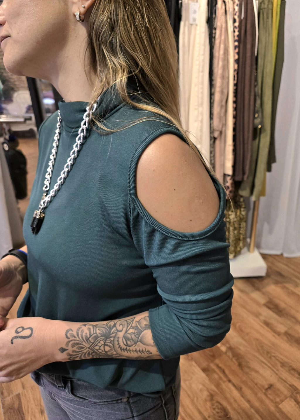 Polera morley liviano , manga larga con hombro visible