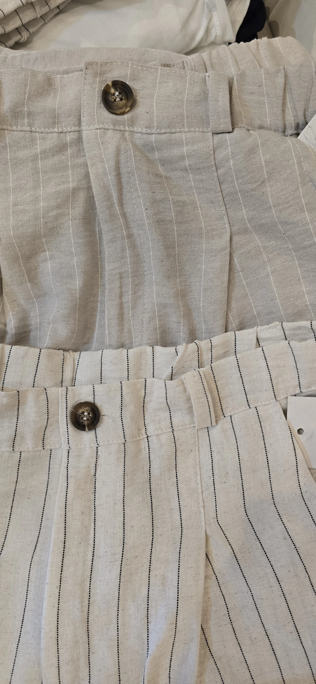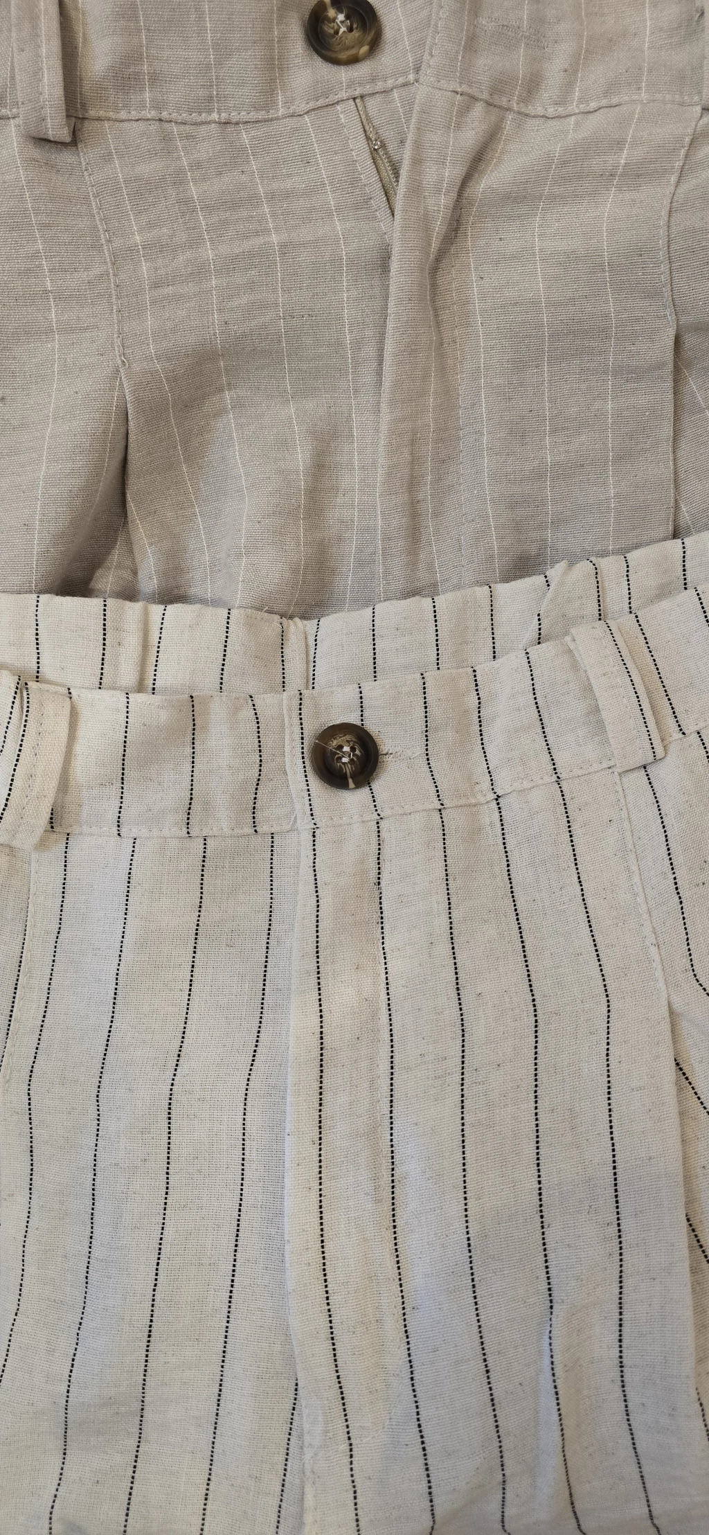 Descubrí la elegancia y comodidad con nuestra Bermuda Pinzada de Lino Rayada. Con un diseño sofisticado y práctico, esta bermuda cuenta con bolsillos laterales y una cintura elástica en la espalda que se adapta a tu figura, brindándote confort durante todo el día.