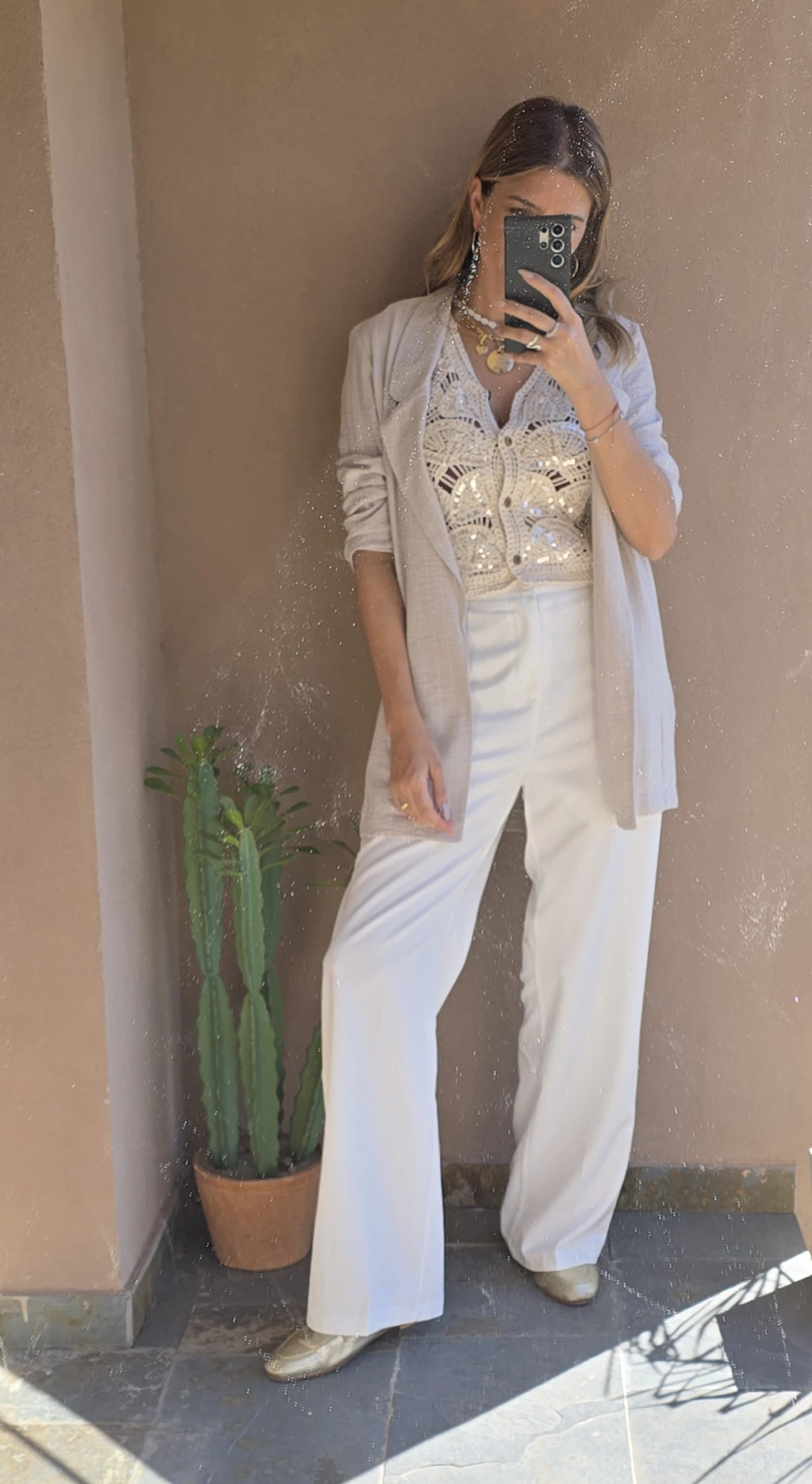 Descubre el Blazer de Lino Rayado Corte Recto, una prenda perfecta para cualquier ocasión. Con tajos laterales y un bolsillo delantero invisible, este blazer combina estilo y funcionalidad. Sin forrería.