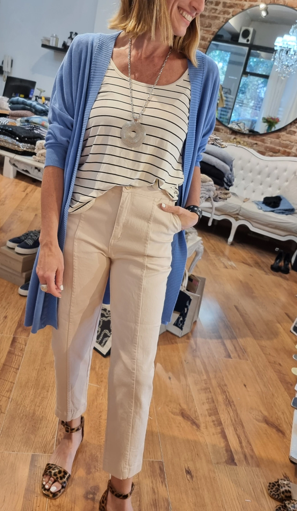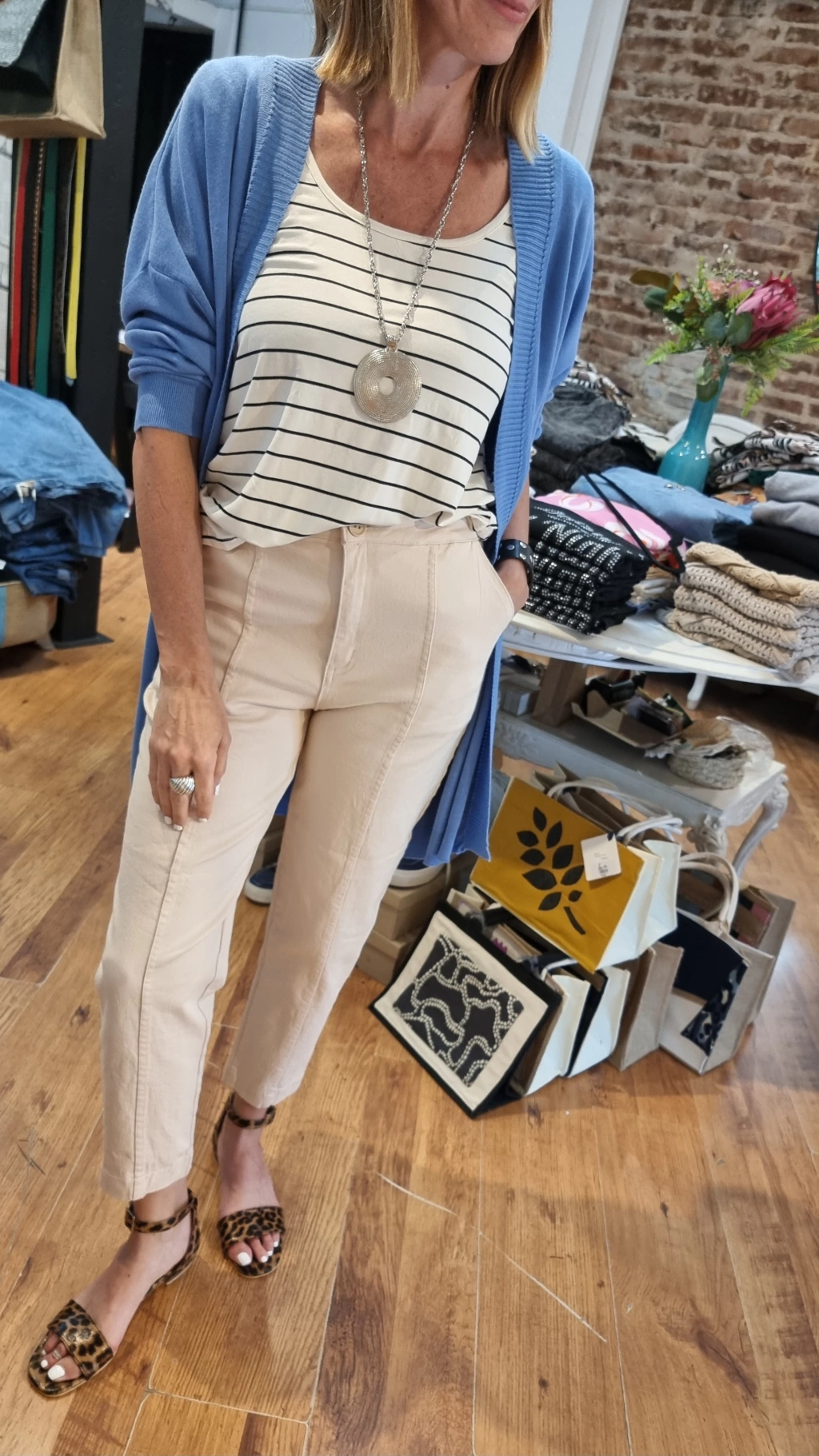 Pantalón gabardina elastizada con bolsillo lateral y pinza al tobillo.
