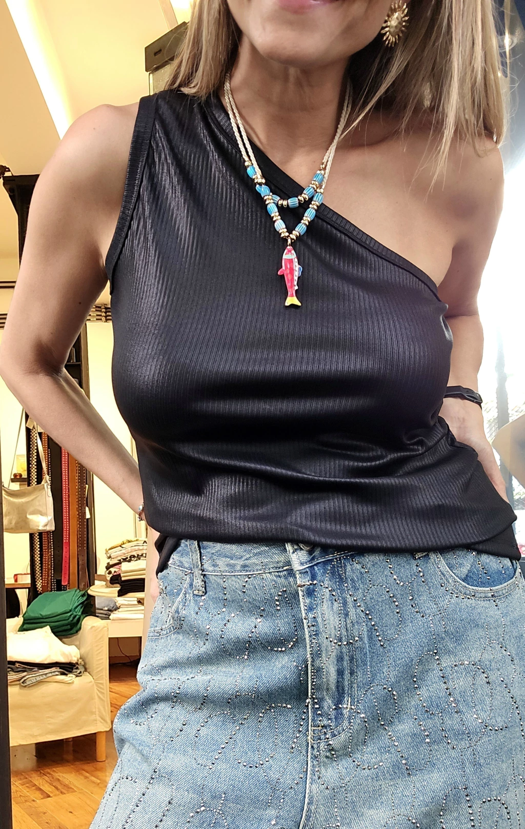 Musculosa de un solo hombro en morley elástizado foil. By Linda de Alma .